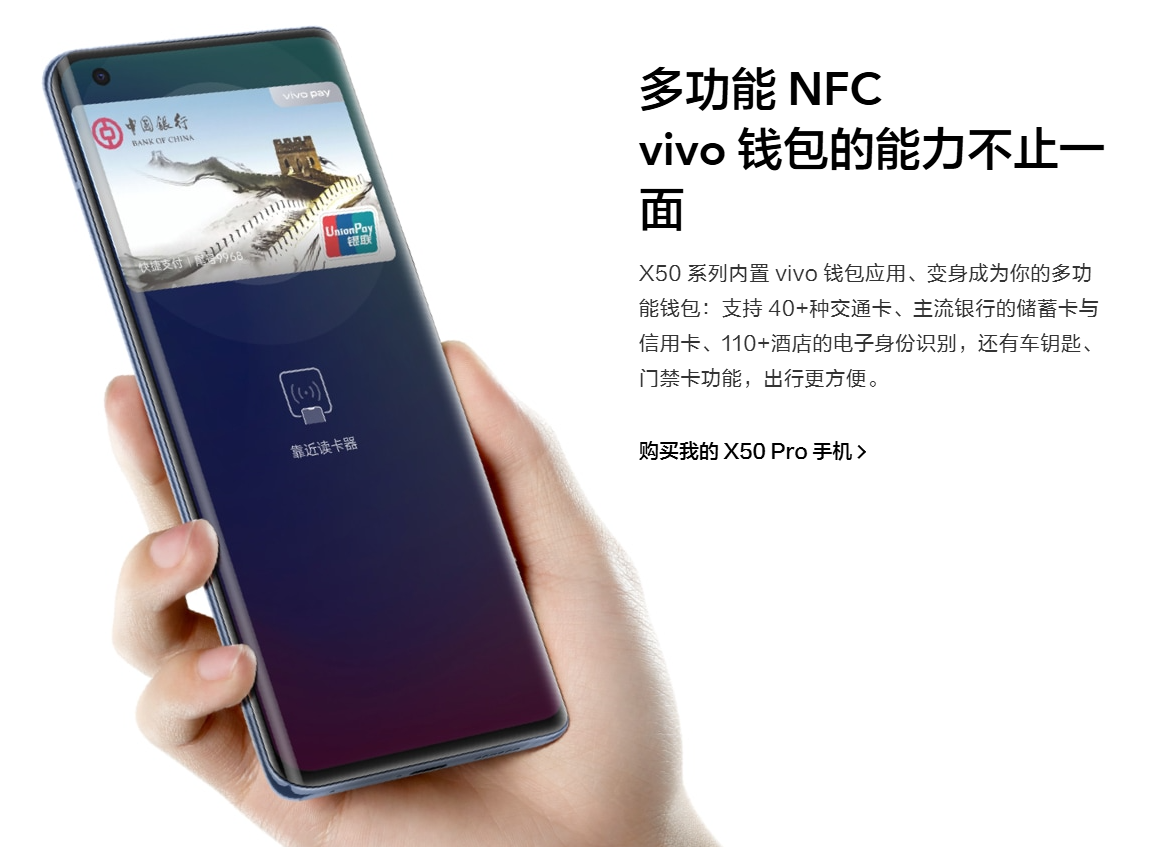 多功能 NFC,vivo 钱包的能力不止一面。X50 系列内置 vivo 钱包应用、变身成为你的多功能钱包:支持 40+种交通卡、主流银行的储蓄卡与信用卡、110+酒店的电子身份识别,还有车钥匙、门禁卡功能,出行更方便。