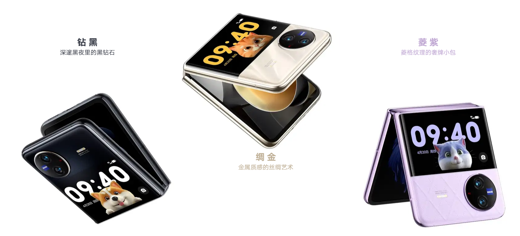 掌心里的百变时尚,掌心折叠设计,机身小巧轻薄,方形外屏与圆形云阶搭配,一体化造型时尚好看。有菱紫、绸金、钻黑三种配色,菱紫如同菱格纹理的奢牌小包,绸金展现金属质感的丝绸艺术,钻黑好似深邃黑夜里的黑钻石。养只宠物,捧在手心,六只灵动萌宠入驻外屏,内置超多款壁纸风格,还可自定义,点亮每天好心情!这六只萌宠分别是球球 - 蓝猫、花花 - 小橘、柴柴 - 柴犬、仔仔 - 比格、团团 - 胖橘、豆豆 - 拉布拉多。