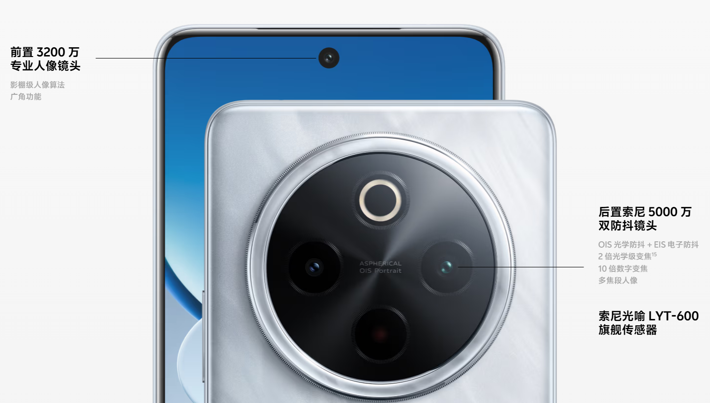 美好影像再加倍,随手成片,前置3200万专业人像镜头,搭载影棚级人像算法与广角功能;后置索尼5000万双防抖镜头,支持OIS光学防抖+EIS电子防抖、2倍光学级变焦15、10倍数字变焦及多焦段人像拍摄。索尼光喻LYT-600旗舰传感器加持,5000万超清镜头让细节尽收眼底,暗光夜景轻松拿捏;OIS+EIS双重防抖16配合抓拍算法,抬手就能出片,稳稳定格高光时刻。后置多焦段人像涵盖1x风光人像、1.5x叙事人像、2x经典人像,远近都美丽,随你灵活切换,黄金人像多焦段搭配索尼超清画质,随手拍摄封面大片。前置3200万专业人像镜头视界超宽广,定格无限可能,搭配影棚级算法,自拍、通话都清晰,系统相机支持广角功能,看清小细节,放眼大视野。支持Live动态照片拍摄,前置后置都可拍,成片能手动设置封面,分享至多个第三方平台17,美好瞬间鲜活“动起来”。趣味影像方面,一拍即得胶片相机功能提供4种色彩风格还原胶片质感,搭配6种自定义相纸,珍贵瞬间更有故事感,还支持一键打印,带来满满的拍照仪式感;AI消除功能可智能识别路人并一键消除,根据环境智能精准还原被遮挡画面,废片秒变大片。