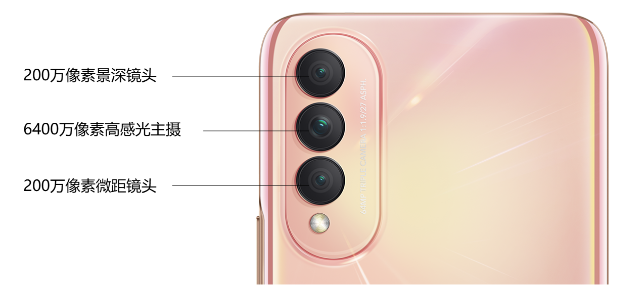 | 后置相机: | 6400万像素(主摄,f/1.9光圈)+200万(景深,f/2.4光圈)+ 200万像素(微距,f/2.4光圈) 备注:不同拍照模式的照片像素可能有差异,请以实际为准。 照片分辨率最大可支持9216×6912像素 |